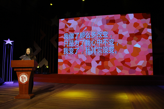 张爽同学率先发言,她用三个“真心”概括了自己四年的上戏生活。从入校前的迷茫、自卑到独挑原创音乐剧《我叫陆小川》的大梁,这样快速的成长令人惊叹。她说:“我做了那么多改变,就是为了我心中不变,我变了,其实我没变。”她用自己的亲身经历告诉在座的每一位同学,无论未来如何,都要把握当下,做一个踏实、靠谱,不惧付出的人。