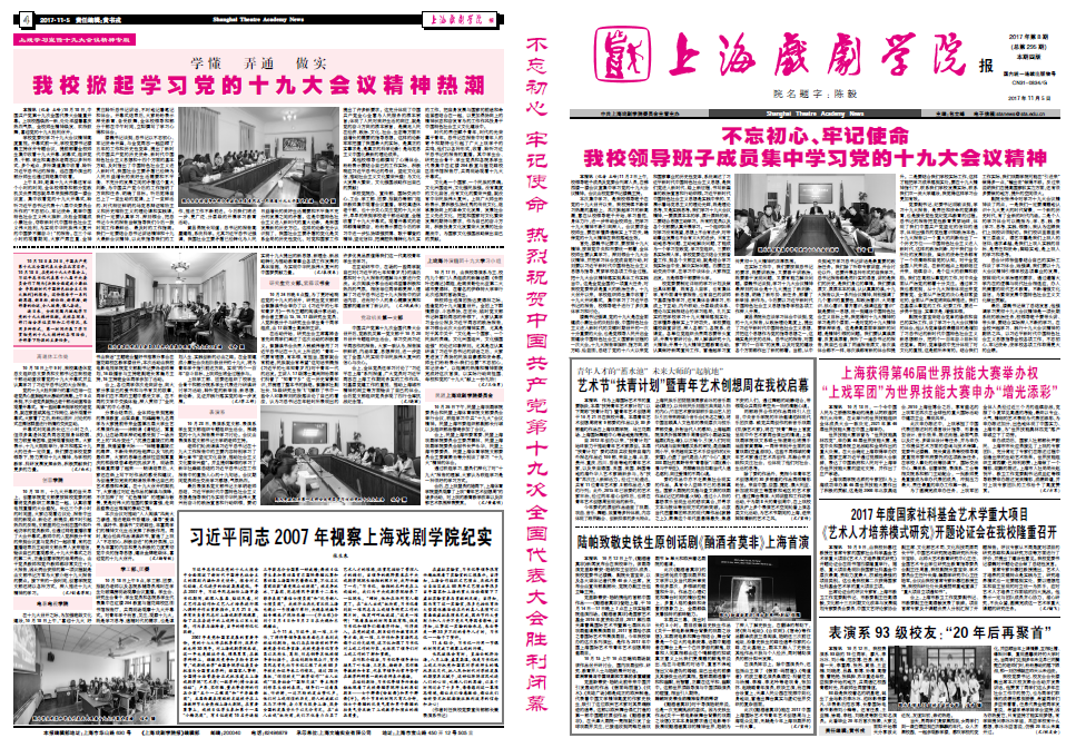《上海戏剧学院报》2017年第8期(总第295期)已于2017年11月5日出版,本期套红,共四版。重点内容有:《不忘初心、牢记使命 我校领导班子成员集中学习党的十九大会议精神》《青年人才的“蓄水池” 未来大师的“起航地” 艺术节“扶青计划”暨青年艺术创想周在我校启幕》《陆帕致敬史铁生原创话剧《酗酒者莫非》上海首演》《上海获得第46届世界技能大赛举办权 “上戏军团”为世界技能大赛申办“增光添彩”》等。敬请关注,也可点击下载阅读。(文、图、编辑:榕树)