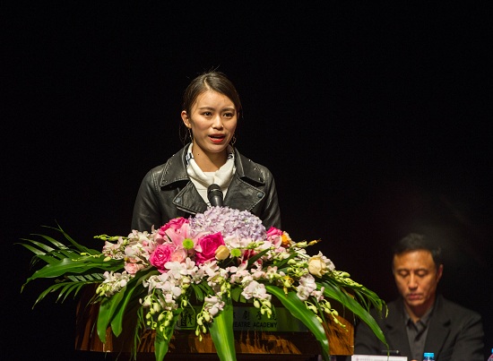 图为奖学金获得者、14级戏剧影视表演专业本科生马小雅发言