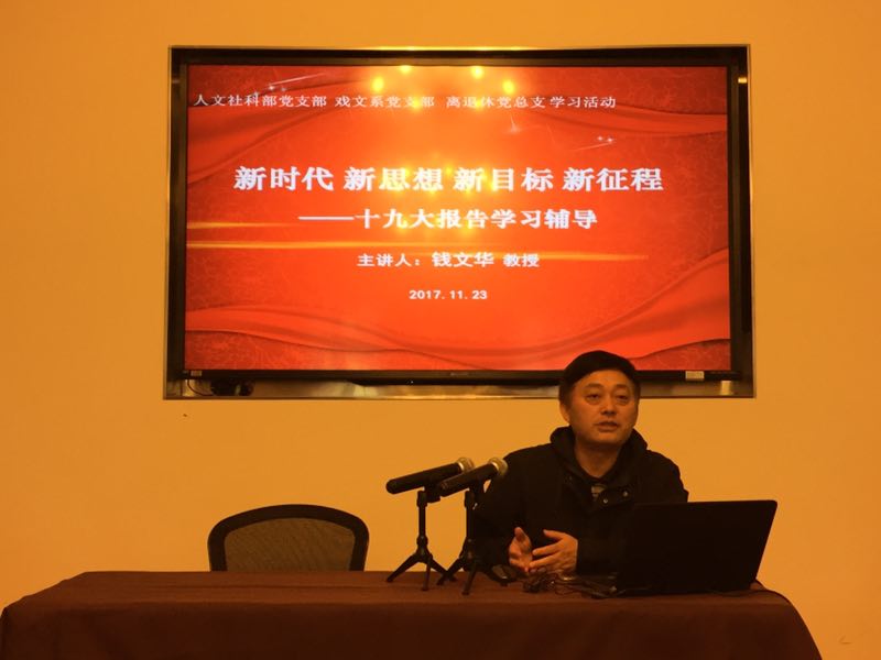 2017年11月23日中午,来自人文社科部党支部、戏文系党支部、离退休党总支的六十余名党员,在佛西楼2楼会议室参加了由三个支部和党总支联合举办的“十九大”精神学习报告会,东华大学马克思主义学院钱文华教授以“新时代新思想新目标新征程”为题做了学习辅导报告。