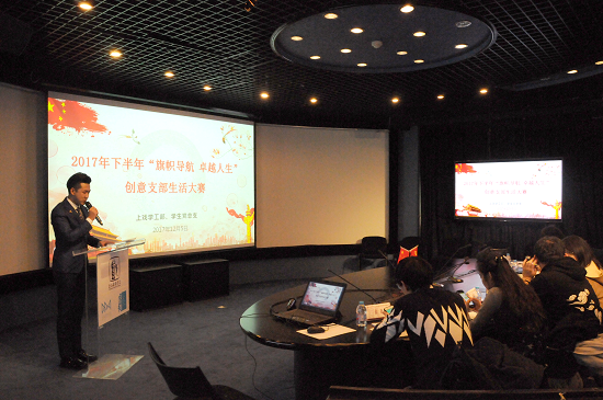 2017年12月5日下午,“旗帜导航、卓越人生”上戏学生党总支创意支部生活大赛在图书馆虚拟实验室召开,来自全校各院系的9个学生党支部进行了支部生活汇报。学工部、团委老师以及各院系学生党支部书记出席活动并担任本次大赛的评委。