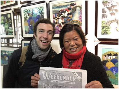 早上七点半,沐浴着晨曦,师生们准时抵达华山路校区,乘坐大巴前往枫泾。在经一个半小时的车程后,我们首先抵达了位于枫泾的金山农民画村并作参观。在导游老师的介绍中我们了解到,原起于灶壁画的金山农民画,以大胆的色彩和稚拙的造型著称,它们并不使用西方的透视法来描绘真实,而是回归到最淳朴的线面来歌颂生活。无怪乎美国友人MAX发出惊叹:“我无法用西方的工艺角度来审视这些画,但我能感受到它们扑面而来的热情和生活气息。”