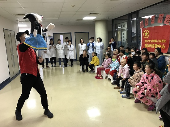 2017年12月28日,阴雨连绵,寒意袭来,但是复旦大学附属儿科医院的礼堂内欢声笑语,热情洋溢。在木偶专业秦峰老师的带领下,由我校木偶专业和主持专业的大学生志愿者们,为儿科医院的医护人员和住院的小患者们奉献了一台精彩纷呈的新年音乐晚会。