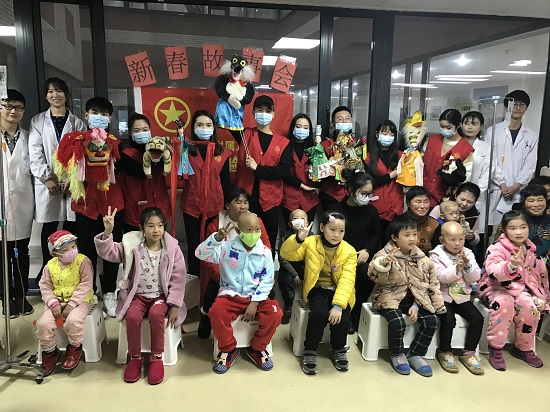 图为复旦大学附属儿科医院新春音乐会现场我校志愿者与小患者合影