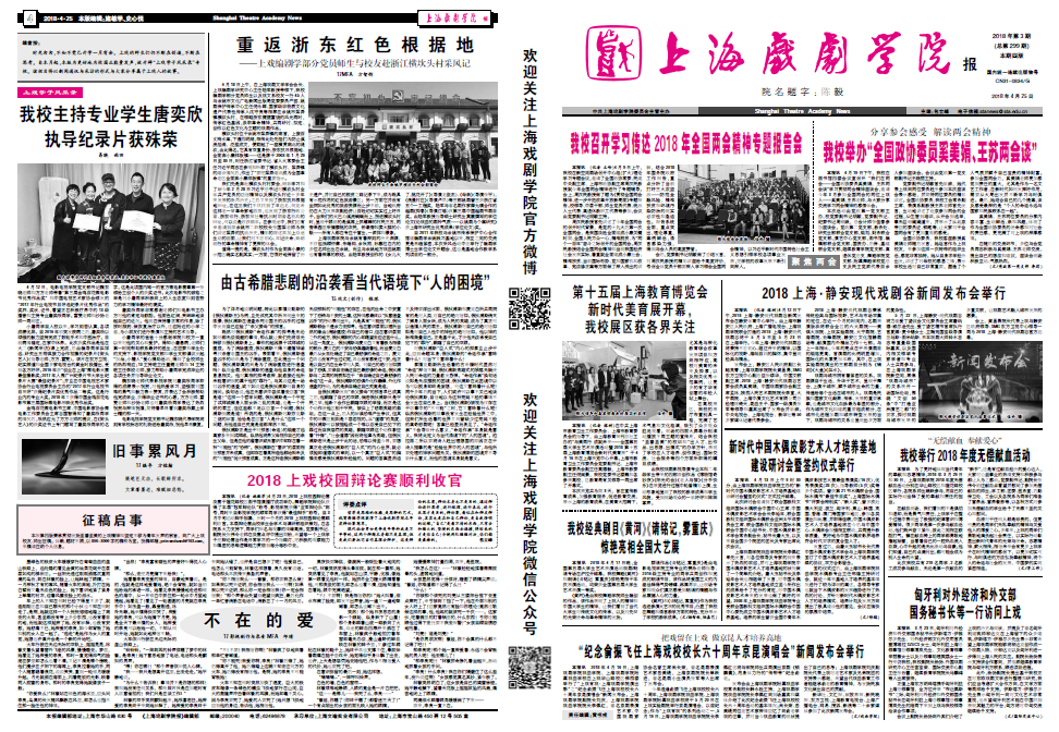 《上海戏剧学院报》2018年第3期(总第299期)已于2018年4月25日出版,本期套红,共四版。重点内容有:《我校召开学习传达2018年全国两会精神专题报告会》《分享参会感受 解读两会精神 我校举办“全国政协委员奚美娟、王苏两会谈”》《第十五届上海教育博览会新时代美育展开幕,我校展区获各界关注》《2018上海•静安现代戏剧谷新闻发布会举行》等。敬请关注,也可点击下载阅读。(文、图、编辑:榕树)