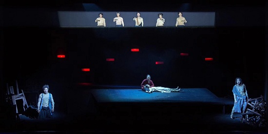 全剧舞美以简约的黑白为主,分三层结构,与明暗相间的灯光融为一体,整个舞台若隐若现、虚虚实实,充满着象征意味;服装设计大胆启用了裸露皮肤的方式突显社会最底层人的生活状态。