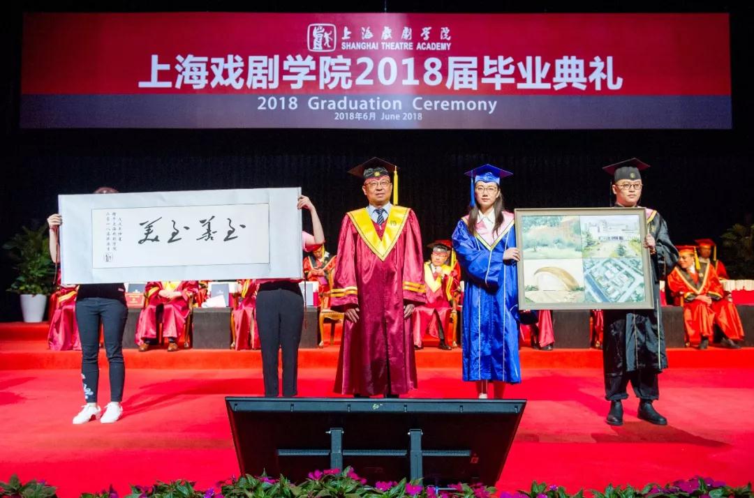 今年的毕业典礼中增加了学校和毕业生互赠礼物的环节,毕业生送给学校的是一幅上戏的四季风景油画,同时学校回赠给所有毕业生的礼物是一幅写着“至善至美”的书法作品。油画中画的是四个校区、四个季节,标志着上戏经过73年的发展,形成了以戏剧、戏曲、舞蹈、影视为主的“四个中心”校区布局和功能定位;而“至善至美”书法作品代表着学校的殷切期望,期望所有毕业生能够成为一名德艺双馨、追求卓越、脚踏实地的上戏人。党委书记楼巍上前与毕业生互赠了礼物并合影留念。