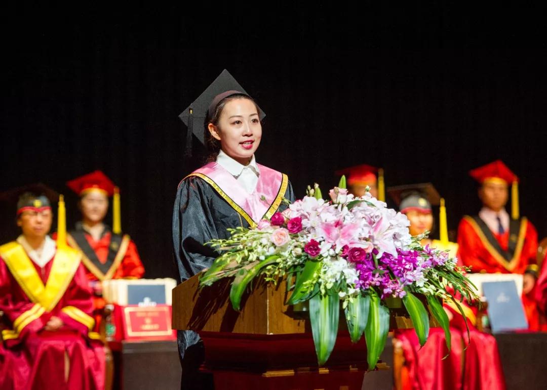 在发言环节,毕业生代表、家长代表、校友代表和教师代表依次上台发言和寄语。戏曲学院本科毕业生炼雯晴首先发言,她向学校和老师表达了感恩之情,回顾了在上戏学习生活的各种场景,立志成为一名优秀的京剧演员。当她成为梅葆玖先生门下年龄最小的入室弟子时,她感悟到,梦想离不开坚持,所有的失去都是值得的。她和所有的毕业生一样,带着对上戏的爱和对未来的憧憬,即将走上不同的人生舞台。研究生代表努尔夏提•艾合买提同学从一名上戏本科生一路读到硕士,他向大家解释了自己名字的含义,努尔在维吾尔语中就是“光”,而他恰巧学的就是灯光专业。他带着对专业的赤诚和热爱在上戏实现了人生的跨越,不仅专业精进,还收获了美好的爱情。他说,上戏教会他面对一切困难时都要认真、勇敢地面对,不忘初心,追随初心!