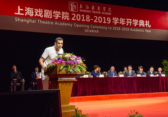 典礼在庄重激昂的国歌声中正式开始。校领导为新生代表佩戴了校徽。表演系2018级本科生代表张令仪、研究生代表杨雅茗、留学生代表Lawrence Farley代表新同学上台发言;教务处处长沈亮老师作为教师代表上台发言,他以“我梦想中的学生”为题,希望2018级新同学要有忧患意识、批判精神、健康身心、阅读习惯,努力追求上戏人才培养的卓越目标;表演系85级校友佟瑞欣作为校友代表上台发言,他勉励同学们要发自内心热爱艺术,给自己设定人生目标,不畏困难,坚定信念。