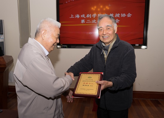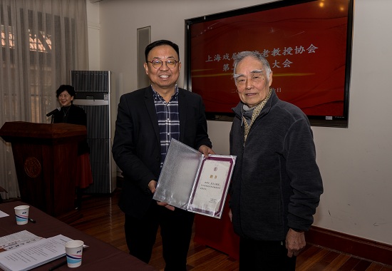 周本义会长为陈明正教授获得“上海市老教授事业贡献奖先进个人”授牌。学校党委书记楼巍向周本义教授颁发了名誉会长聘书。