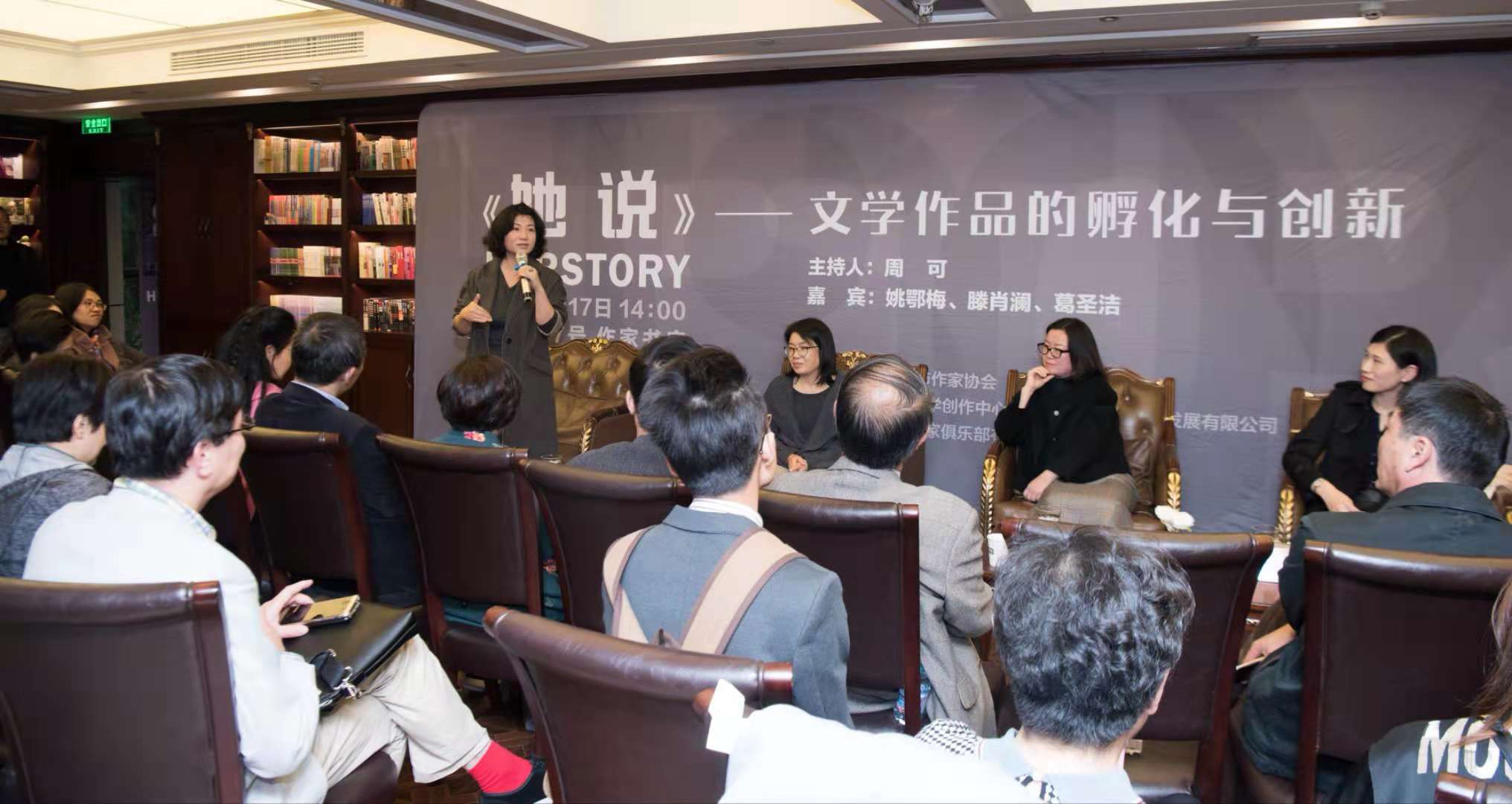 2018年11月17日,由上海市作家协会携手上海戏剧学院共同主办的“《她说》——文学作品的孵化与创新”主题沙龙活动于静安区巨鹿路677号作家书店顺利举行。上海市作家协会党组书记王伟,市作协党组副书记、秘书长马文运,上海戏剧学院副院长、上海市作家协会兼职副主席杨扬,上海戏剧学院规划办主任、学科办主任、科研处处长吴爱丽,上海文学创作中心副主任朱益明等领导出席。沙龙活动由四位主讲人:知名作家姚鄂梅(小说《西门坡》作者),上海戏剧学院导演系讲师周可(《她说》策展人),鲁迅文学奖中篇小说奖获得者、全国作协会员滕肖澜,上海作协签约作家葛圣洁展开对话。