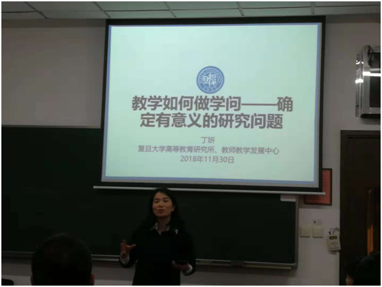 教学该如何做学问?这个话题一直困扰着非教育学科背景却从事专业课程教学的教师们,很多青年教师在专业课堂上是一把能手,但做教学研究、写教学类文章却是困难重重,教学研究作为教师反思和提升自己教学的有效途径,是许多教师目前亟需解决的问题。因此,继11月8日学校“教师教学能力提升系列讲座”第一讲开讲并取得良好效果后,11月29日下午,复旦大学高等教育研究所副研究员、教师教学发展中心副主任丁妍老师受邀为我校青年教师作了“教学如何做学问”专题性讲座。