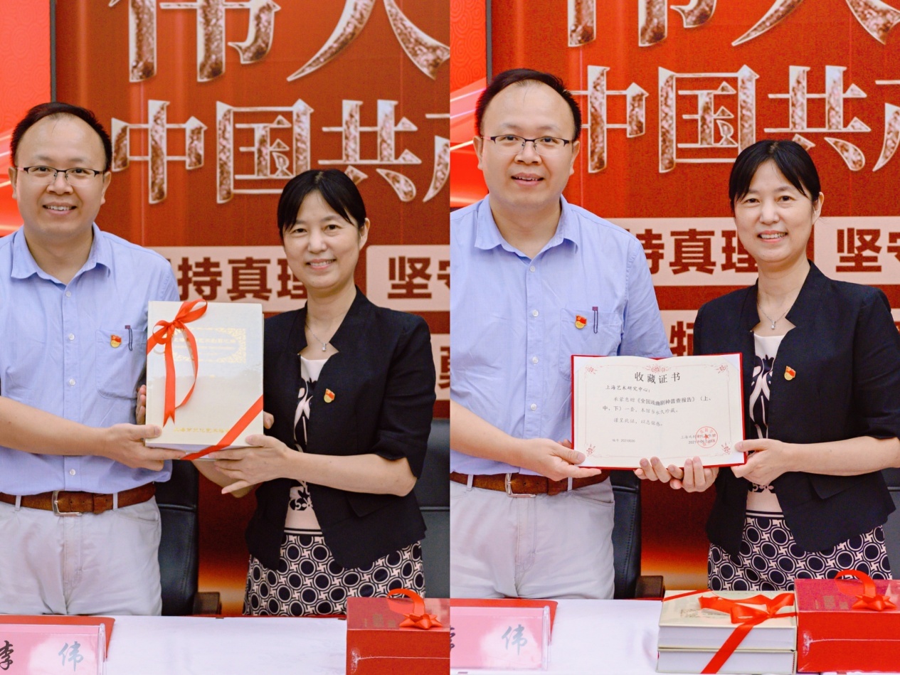 签约仪式结束后,宾主双方就如何学好用好“学习强国”平台、如何将党建工作与业务工作结合起来相互促进等话题展开了深入地经验交流。活动中,上海艺术研究中心向上海戏剧学院图书馆赠送该中心编撰的珍贵图书《上海舞台艺术剧目汇编(1950年-2018年)》(47本)与《全国戏曲剧种普查报告》(3册)各一套。这两套书,凝聚着艺术中心各位老师多年的心血,对上戏师生大有裨益。上戏图书馆特别制作了精美的收藏证书,以志铭感。