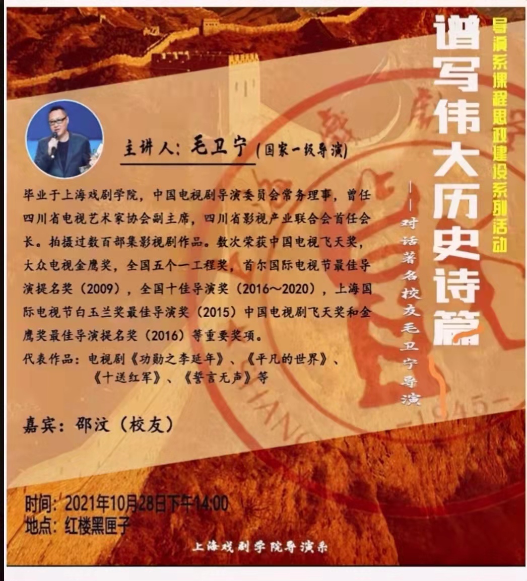 10月28日下午2点,导演系邀请了上戏校友毛卫宁导演做客红楼黑匣子,面向全校师生开展一次题为“谱写伟大历史诗篇——对话著名校友毛卫宁导演”名家对话,此次对话由导演系党总支副书记石俊主持。电视剧《功勋之李延年》的男二号——表演系96级校友邵汶作为特邀嘉宾共同参加了对话。毛卫宁导演结合近期热播的三部影视作品《百炼成钢》、《功勋》和《霞光》,谈了他如何创新结构和形式,在戏剧美学上有所突破,让重大现实主义题材作品、革命历史题材作品等主题剧的创作成为观众喜闻乐见的作品。