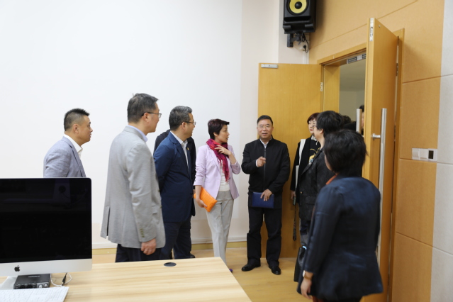 王健儿一行在昌林路校区参观了剧院、摄影棚、放映厅、录音棚等各类教学设施。