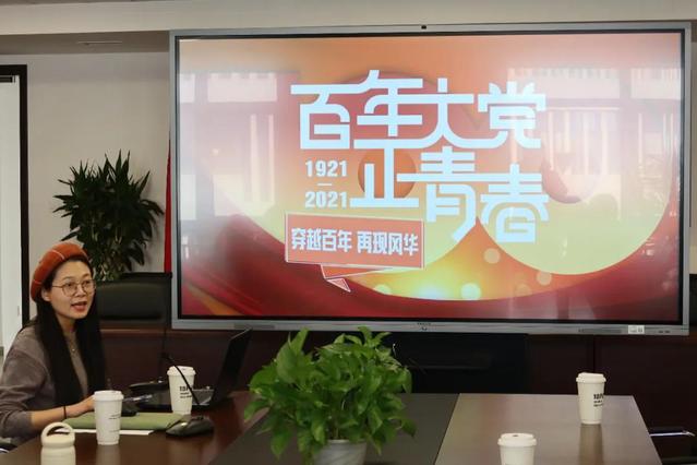 电影学院党总支副书记王春云为东方广播中心第四党支部的同志们介绍了电影学院党总支党史学习和特色活动情况。重点推介了以沉浸式戏剧党课《第十二人》和新生入学仪式《当我带上校徽的时候》为代表的电影学院课程思政理论学习和艺术实践,展示了电影学院的党政建设和师生风采。