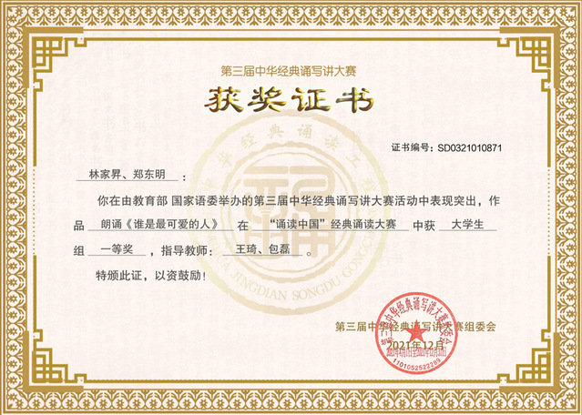 在教育部、国家语委举办的第三届中华经典诵写讲大赛中,18主持林家昇、19主持郑东明朗诵的《谁是最可爱的人》(指导老师:王琦、包磊)荣获“诵读中国”经典诵读大赛大学生组一等奖。
