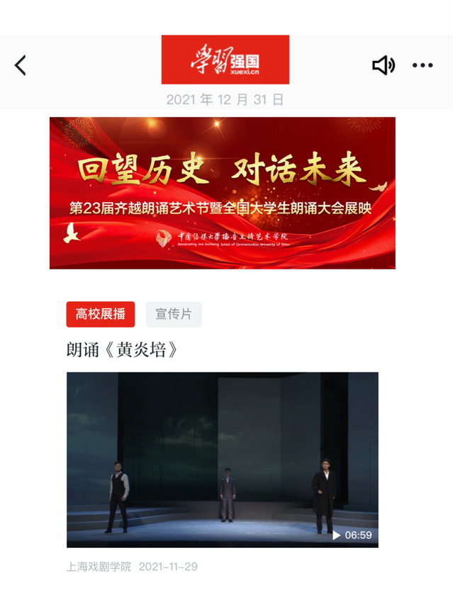 在教育部、国家语委主管,中国传媒大学主办的第23届齐越朗诵艺术节暨全国大学生朗诵大会中,上戏学子继续创造佳绩,18主持林海涨、黄云涛和20主持董乐同学朗诵的《黄炎培》(指导老师:董健、王琦)荣获“艺术表现特别奖”。