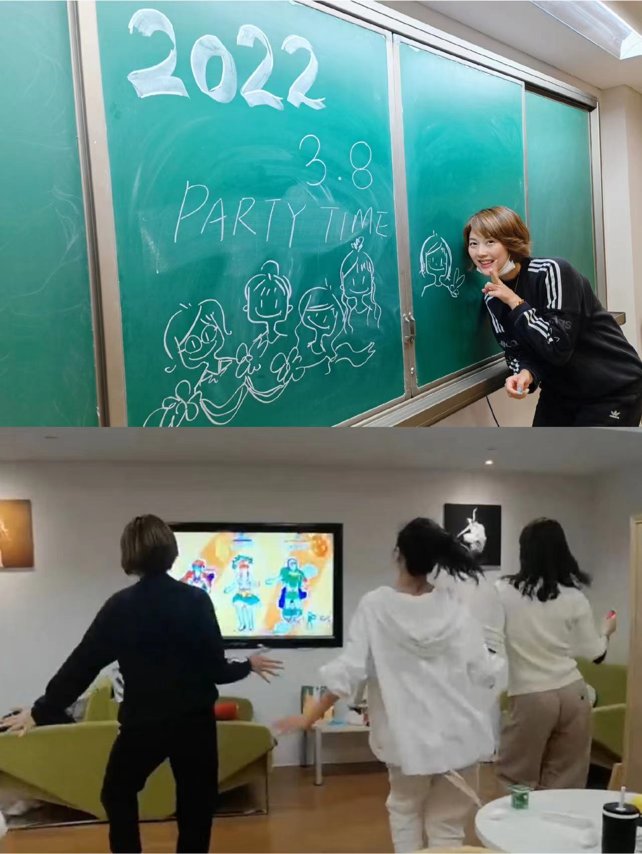 教职工们也分教室分场地开展了画板报,分享音乐歌单、合作游戏等多样活动。