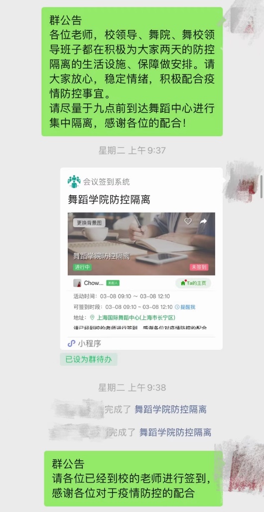 在封控期间,校领导班子、校疫情防控小组、教师工作部也向舞蹈学院发来了慰问,关心教职工在48小时内的情况与需求,并积极安排落实,解决实际困难。