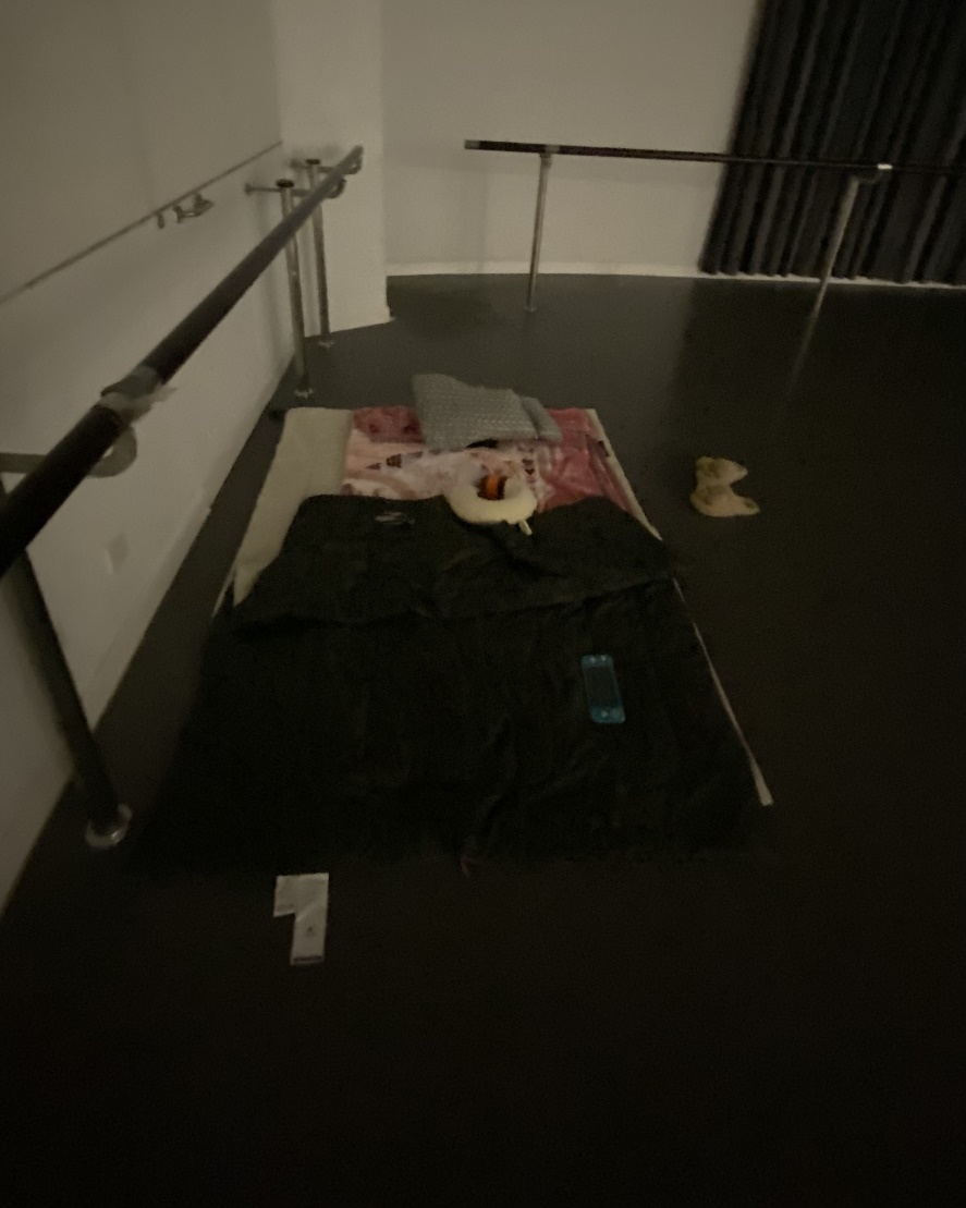 虽然是在教室里“打地铺”,老师们三三两两分散诺大的教室里,保持着安全距离,但“夜话会”的时光却像是回到了学生时代,平添了不少欢声笑语。这场战疫,让舞院人的心距更近了。办公室刘建明老师则充当了一回“巡夜人”,确保每一位教职工就寝后才安然睡下。