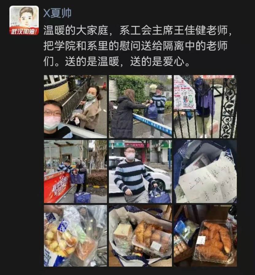 天气虽然阴冷,但抵挡不住导演系党总支对各位教师的暖心关爱。老师们拿到佳健老师送来的“爱心包”后激动不已,纷纷表示他辛苦了,并为这位特殊的快递小哥送上了五星好评。佳健老师说:“不辛苦,反而很快乐️,盼春来!如果我被封闭,老师们也会给我送的。大家有什么需要尽管跟我说,别客气,周四我还可以送。”