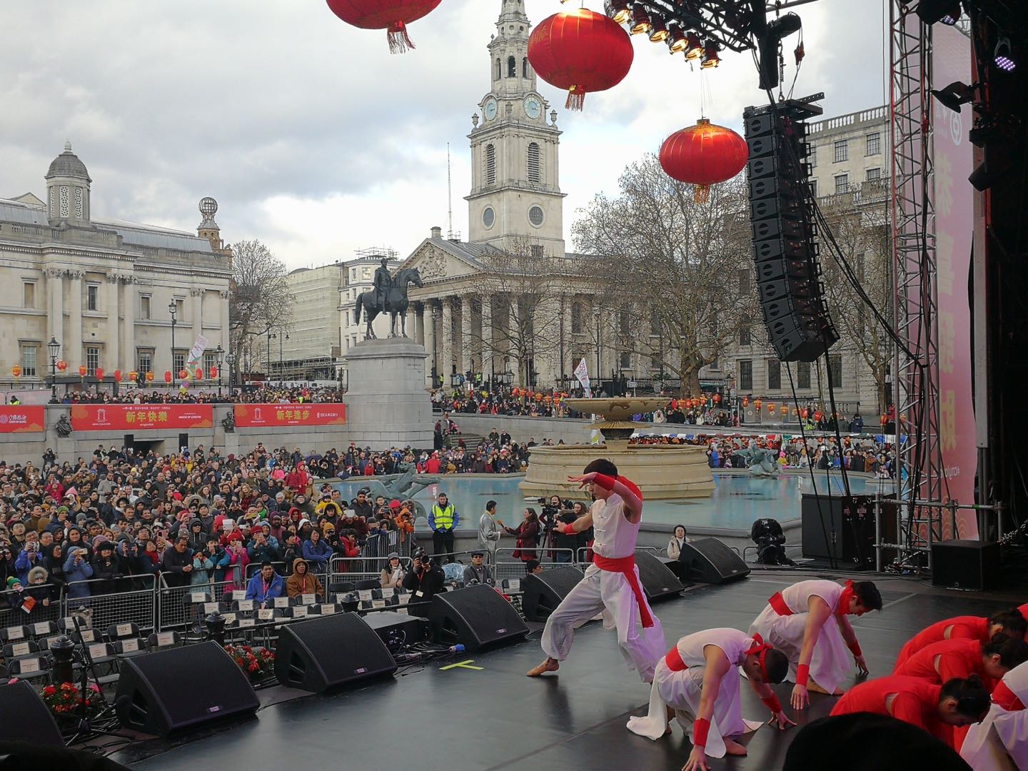 2月9日,演出团前往伦敦近郊的海事博物馆,在其室内广场“great map”与当地中国传统文化艺术团体联合演出。当天的演出也是海事博物馆组织的传统亲子日活动内容之一,精彩的演出赢得众多欧洲年轻父母和儿童的热烈欢呼。演出结束后,使馆安排演出团参观了附近的格林尼治皇家天文台,看到了把地球分为东西两半的本初子午线。这天共有三场演出:一是英国国家美术馆剧场内一场,二是有伦敦华人商会联络邀请的特拉法加露天广场两场演出。特别是室外演出,演员穿上演出服,在临时搭建的室外更衣室候场时已是瑟瑟发抖,但台下打着雨伞观看演出的观众人山人海,还是让我们很感动也很振奋,演员们圆满完成了演出任务。至此,欢乐春节—伦敦站落下帷幕。