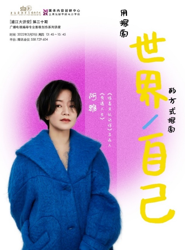 2022年3月31日,由上海戏剧学院电影学院主办的【浦江大讲堂】第三十期、广播电视编导专业影视创作系列讲座“用探索世界的方式探索自己”如期于线上举行。此次讲座由廖媌婧副教授组织并主持,特邀纪实真人秀《很高兴认识你》出品人柳翰雅进行讲演,电影学院院长厉震林教授、广播电视编导专业负责人肖湘宁副教授等出席并做发言。讲座的主要对象为电影学院广播电视编导专业学生,同时吸引了来自校内外师生及学者,共计百余人。