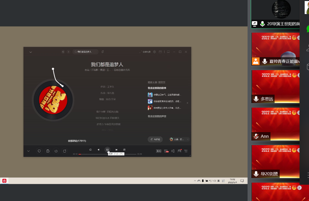 五月春风情深意暖,五月花海流溢飘香。为纪念“五四”运动,庆祝中国共青团成立100周年,引导青年学生勇作时代先锋,5月4日下午3点,导演系团总支特举办“青春心向党,建功新时代”同一首歌----五四线上歌会。导演系负责人卢昂教授,导演系党总支书记尹悦蓉老师,导演系学生党支部书记、团总支书记、专职辅导员夏帅老师和部分班级班主任老师在腾讯会议和导演系本硕博全体青年学生一同参加了此次活动。