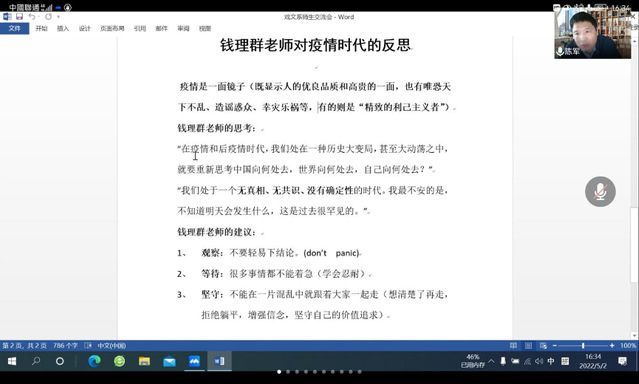 第二部分“自我调适,做自律的学习者”中,徐煜老师针对学生们最为关心的诸如考试放假、线下复学、毕业开题、课业负担等教学安排问题进行了一一答复,并对特殊时期同学们的学习效率和思考深度提出了一些期望。