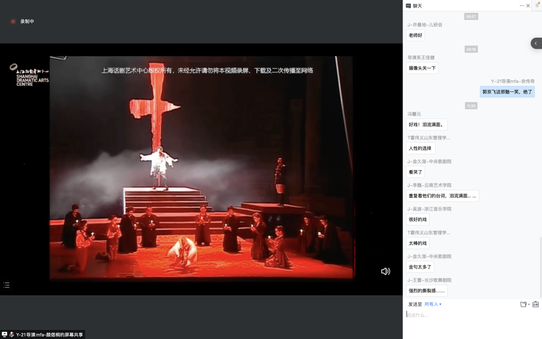 当前,国内外戏剧生态的多样性态势更胜从前,这对戏剧导演加强自身原创力提出了更高的要求。同时,疫情的蔓延也为导演带来了更多挑战与机遇。雷国华老师从自己创作的戏剧作品出发,从“导演原创力开掘在当代的重要性”、“开掘与拓展导演原创力的维度”、“导演的原创力——开掘寻找戏剧作品的当代意识”和“开掘拓展中国近代文学作品中的创作领地”全方位地激发同学们对导演原创力的理解和认识。鼓励同学们在“中国及世界的文学宝库中开掘导演原创力”。