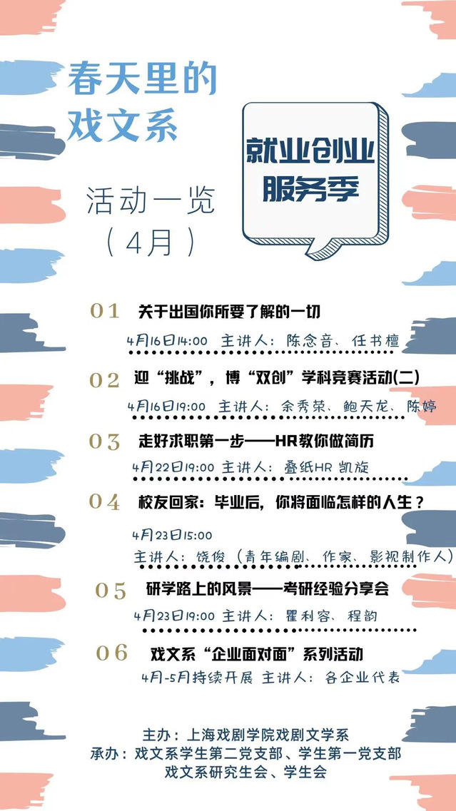 面对突如其来的疫情和当下就业形势的挑战,戏文系为了帮助大学生更快、更充分就业,多措并举、多方联动,把毕业生就业工作作为当前最紧迫的任务。多次召开院系党政联席会研究毕业生就业工作举措,通过全体教师大会、《致全体戏文系研究生导师的一封家书》、《致班主任的一封信》等,发动导师、班主任与全系教师合力开拓就业渠道和就业岗位,加大毕业生就业推介力度。同时,开启 “就业创业服务季”活动,针对学生的多元需求,开展一系列关于就业、考研、出国等相关活动,邀请各企业、优秀校友等与同学们云上见面,提升学生职业素养和就业能力,暖心为2022届毕业生保驾护航。希望毕业生们能够通过不断线的就业创业服务,找到自己心仪的工作岗位,逢伯乐,成事业,实现未来与梦想的双赢。