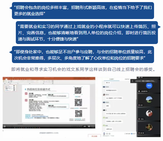 随后,同学们进入“云端”面试环节,本次招聘会为学生量身打造,充分结合上海戏剧学院及我系毕业学子求职群体的特点,邀请到行业内影视行业的领头单位,涵盖了编剧类、编导类、策划类、运营类等多个职位,打通人才与企业招聘的绿色通道,努力实现上戏学子求职全程无缝对接。