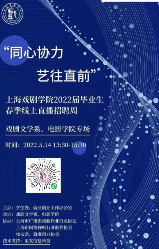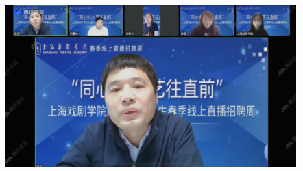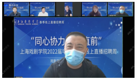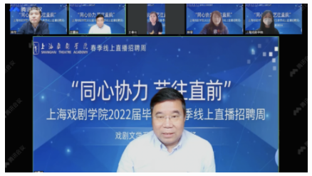经过精心筹备,“同心协力艺往直前”上海戏剧学院2022届毕业生春季直播招聘周——戏剧文学系、电影学院专场于2022年5月14日顺利举办。在学生处牵头主办下,戏文系与电影学院同心协力,并得到上海市广播影视制作业行业协会、上海市网络视听行业制作协会、校友会鼎力支持。上海戏剧学院党委副书记、副院长张伟令,戏文系党总支书记张璟、系主任陈军,以及戏文系、电影学院、各职能部门的领导老师参与到招聘会开幕式中。