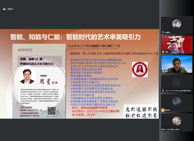 2022年10月25日下午1点30分,教育部高校戏剧与影视学类专业教学指导委员会主任、北京师范大学艺术教育研究中心主任、博士生导师周星教授应邀为上海戏剧学院师生作了题为《智能、知能与仁能:智能时代的艺术审美吸引力》的学术讲座,本次讲座由上海戏剧学院戏剧文学系、编剧学研究中心以及研究生部联合举办。讲座由戏文系主任陈军教授主持,采用线上方式,吸引了多所高校的老师、学生等逾百人聆听。