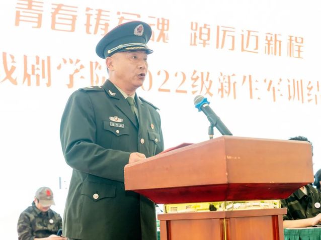 校党委副书记、副院长张伟令代表学校,向全体承训官兵和工作在军训一线的老师们表示感谢。他说,在刚刚胜利闭幕的党的二十大上,习近平总书记对青年寄予了殷切期望:“广大青年要坚定不移听党话、跟党走,怀抱梦想又脚踏实地,敢想敢为又善作善成,立志做有理想、敢担当、能吃苦、肯奋斗的新时代好青年”。同学们要牢牢把握新时代新征程这一最大的人生际遇和人生考验,保持永不懈怠的精神状态、永不停滞的前进姿态,用青春的能动力和创造力激荡起民族复兴的澎湃春潮。希望大家以军训为序章,学习军人“在弦上”的战斗姿态,“在肩上”的责任担当,“在路上”的韧劲毅力,秉承发扬至善至美的校训精神,在追求戏剧艺术的路上修身守正、崇德尚艺,做一名有信仰、有情怀、有担当的新时代文艺青年。