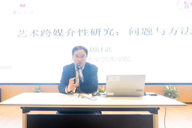 之后,作为该课程第一场次的校外主讲周计武教授正式开课。周老师首先从媒介的角度指出,数字时代即媒介融合时代。接着从艺术的跨媒介转向、艺术的媒介之维、现代艺术媒介的分立、数字时代艺术媒介的整合、艺术的跨媒介性研究、艺术跨媒介性研究的未来六个方面阐述跨媒介性艺术研究的方法论。