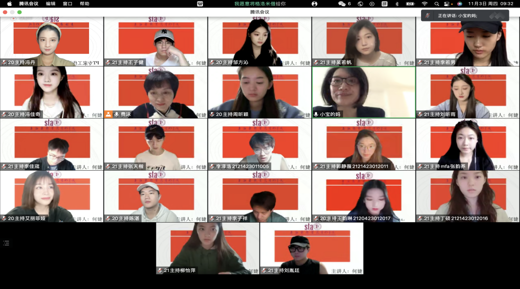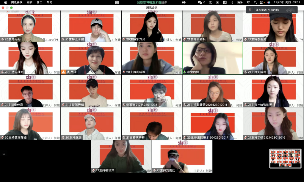 11月3日上午,上海广播电视台融媒体中心首席主持人,驻校艺术家何婕老师的PT专家工作坊首次给电影学院主持专业的大二、大三学生行课。受疫情影响,师生们借助腾讯会议开展了互动交流,主持专业主任费泳老师主持了专家工作坊。