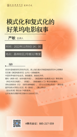 2022年11月4日,由上海戏剧学院电影学院万传法教授组织并主持,资深外国电影研究员和评论员、原上海交通大学美国电影研究中心特聘研究员严敏先生主讲的讲座顺利举办。本次讲座的题目为《模式化和复式化的好莱坞电影叙事》,讲座的主要对象为上海戏剧学院“影视剧作分析”课程的学生,但也吸引了来自校外的众多学生与学者,反响十分热烈。