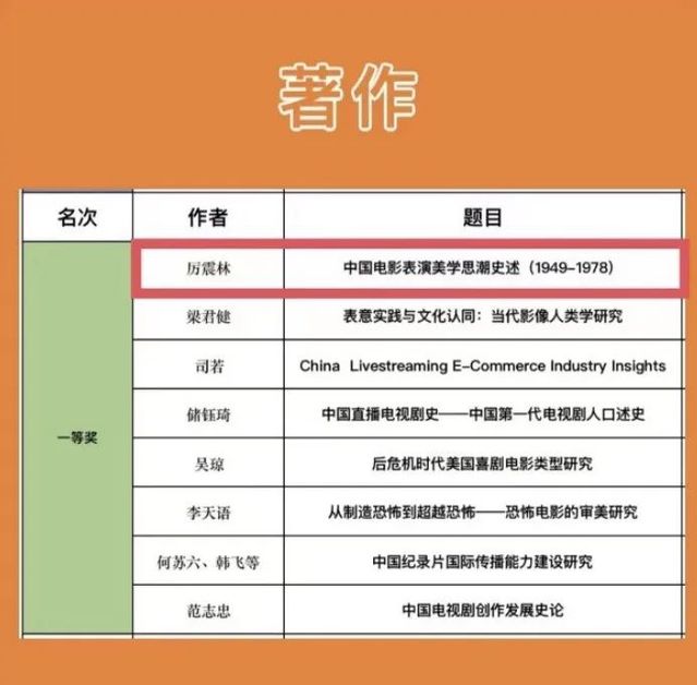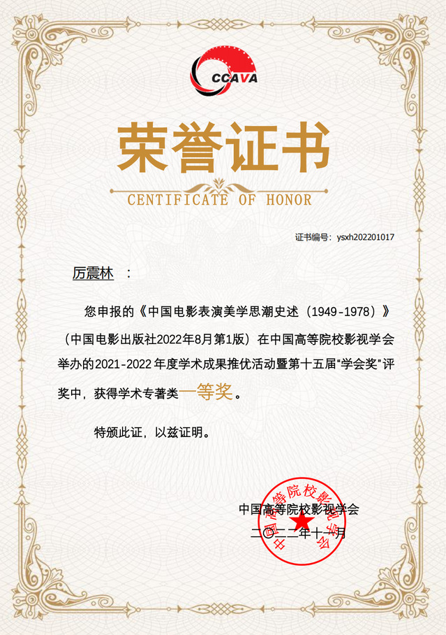 在第十五届“学会奖”获奖名单中,电影学院院长厉震林教授的著作《中国电影表演美学思潮史述(1949—1978)》荣获著作单元一等奖(排名第一)。