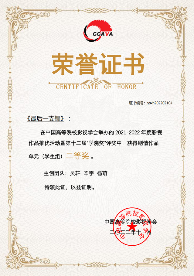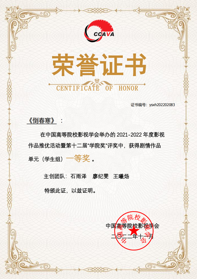 电影学院学生石雨泽、廖纪雯、王曦炀的作品《倒春寒》(毕业创作,指导教师:魏东晓、方虹)获得剧情片单元(学生组)一等奖(首奖);吴轩、辛宇、杨萌的作品《最后一支舞》(指导教师:侯咏、高子逸、廖媌婧、周艺文)获得剧情片单元(学生组)二等奖;刘知铨、龙青的作品《况且你听》(指导教师:沙扬)获得短视频单元(学生组)三等奖(首奖)。