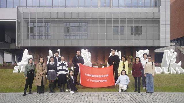 创意学院党的二十大精神宣讲团,以研究生党员为主,同时包含了部分本科生党员以及入党发展对象、积极分子等。创意学院党总支书记方军担任理论指导,党总支副书记唐芳任运营指导,辅导员孔小磊、陈龙任领队。