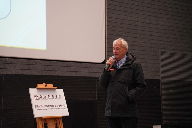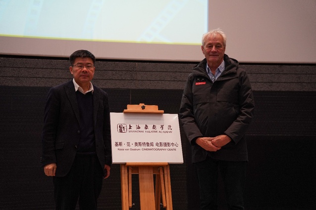 基斯·范·奥斯特鲁姆教授作为一位国际知名电影摄影师和电影教育家,先后参与了国际上80多部影视作品的拍摄,包括获得艾美奖的电视剧集、电影和纪录片。黄昌勇院长和基斯教授上台,就基斯·范·奥斯特鲁姆电影摄影中心成立合影留念。基斯教授对此发表了致辞。
