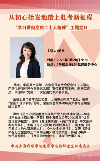 为进一步深入学习贯彻党的二十大精神,加强党史学习教育与专业建设相结合,2023年3月20日,上海戏剧学院电影学院教师党支部举行“学习贯彻党的二十大精神”主题党日活动,邀请中国共产党第二十次全国代表大会代表、中共一大纪念馆宣传教育部主任杨宇同志,为支部党员和部分学生党员、积极分子作主题为《从初心始发地踏上赶考新征程》的专题讲座。