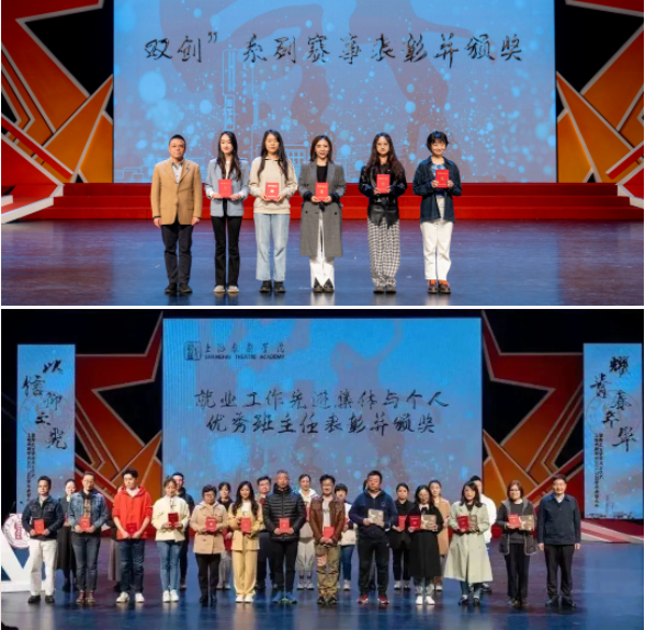 上海戏剧学院党委副书记、副院长张伟令,副院长唐立兔,总会计师张佳春和应邀出席大会的上海学生事务中心副主任周红星,分别为获奖师生颁奖。