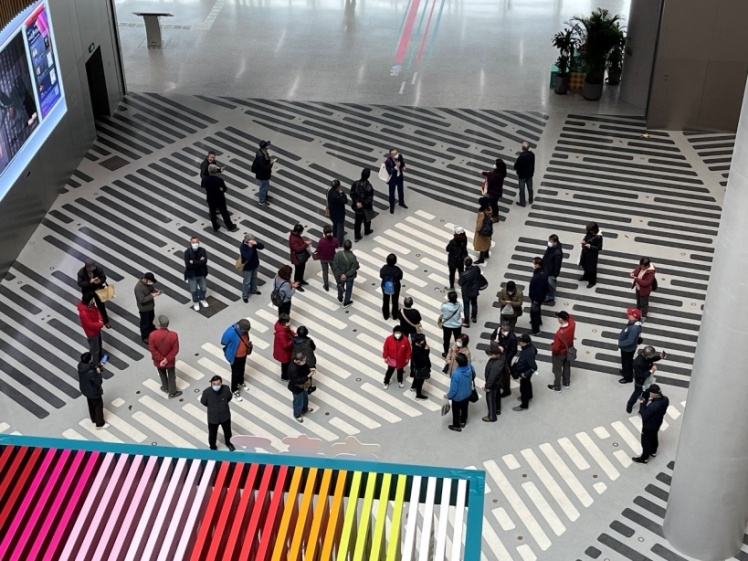 在上图工作人员的带领下,离退休党员同志们步入上海图书馆东馆中庭,大型地面公共艺术品《往来春秋》映入眼帘,抽象化的报纸、文献、文字演绎成数百平米的水磨石图案,黑白分明,低调沉静,不失灵动。走在中庭“字里行间”平视,步入三层俯视, 随着视角的移动给大家留下了完全不同的感受。