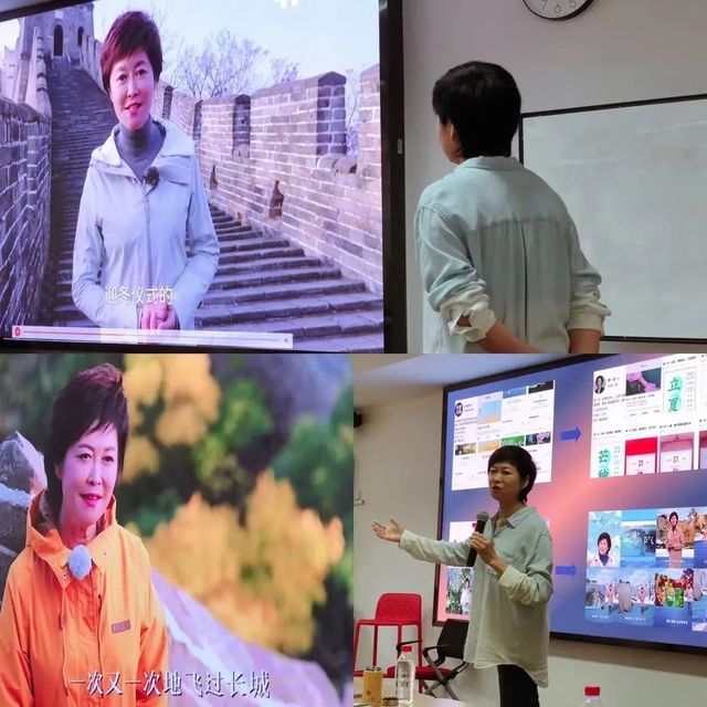 敬老师主要围绕着该节目创作特点——“一镜到底”,展开了分享。9分钟的一镜到底,既是一种尝试也是一种挑战。由于节目时长的限制,偌大的博物馆如何设定拍摄路线?由何起至何终?如何将鲜为人知的转变成广为人知的?这都涉及到主持人的价值判断。作为呈现者及传播链条的最后一个部分,如何调动自身形象及声音以合适的方式传播节目内容,非常考验主持人的综合呈现能力。敬一丹老师以“皮影戏博物馆”为题与同学们展开互动,询问同学们的呈现方式,同学们使出浑身解数积极予以回应。最后敬一丹老师分享了自己关于皮影戏博物馆的呈现——边移动边说,并在各个节点进行停留讲述,最终串联成完整的节目链条。