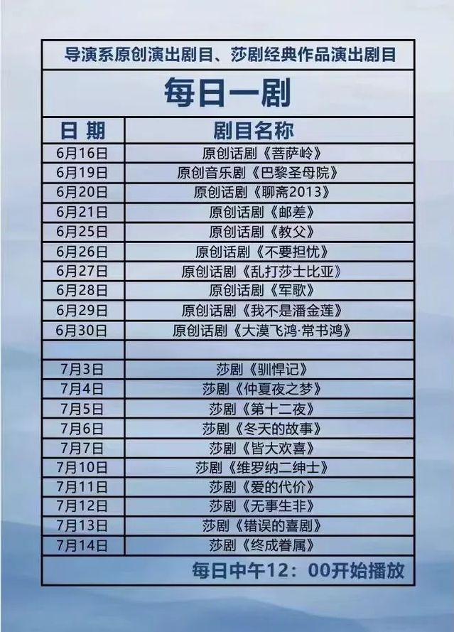在本次导演系的“航行之旅”中,参观者还可在每日午间十二点,观看“每日一剧”。这些作品是导演系优秀文艺作品的成果,选取了10部导演系新世纪以来原创演出的具有代表性的教学作品,以及10部由英国皇家戏剧学院前院长巴特教授排演的莎士比亚经典剧目。