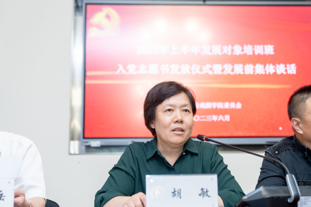 仪式结束后,胡敏与在座的党员发展对象进行了一次入党前集体谈话。她首先祝贺大家顺利完成了发展对象培训班的学习。其次希望大家牢记初心和使命,做到心中有党、心中有民、心中有责、心中有戒。心中有党第一是要有坚定的政治立场,第二是要始终争做表率,第三是要维护党的形象;心中有民就是心中要有全心全意为人民服务的精神;心中有责就是每位党员心中都要有强国的责任;心中有戒就是每位党员心中都要有规矩意识,纪律意识。最后叮咛大家“组织上入党一生一次,思想上入党一生一世”,以此来勉励同学们砥砺前行,不断奋斗。