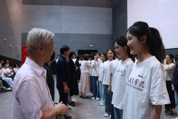 “我自己也同样非常幸运,我和母校同龄。”电影学院前身“电视艺术系”的创办者、80岁的张仲年先生精神矍铄地站上讲台,将一段尘封的历史娓娓道来。从虹口横浜桥边的初心,到华山路的正式启航,再到如今昌林路校区的崭新图景,张老师个人的成长史与上戏80年的发展史交织辉映,让历史变得鲜活可感。他寄语新生:“要求真、扬善、尚美……努力成长为AI时代科艺融合的复合型人才”。
